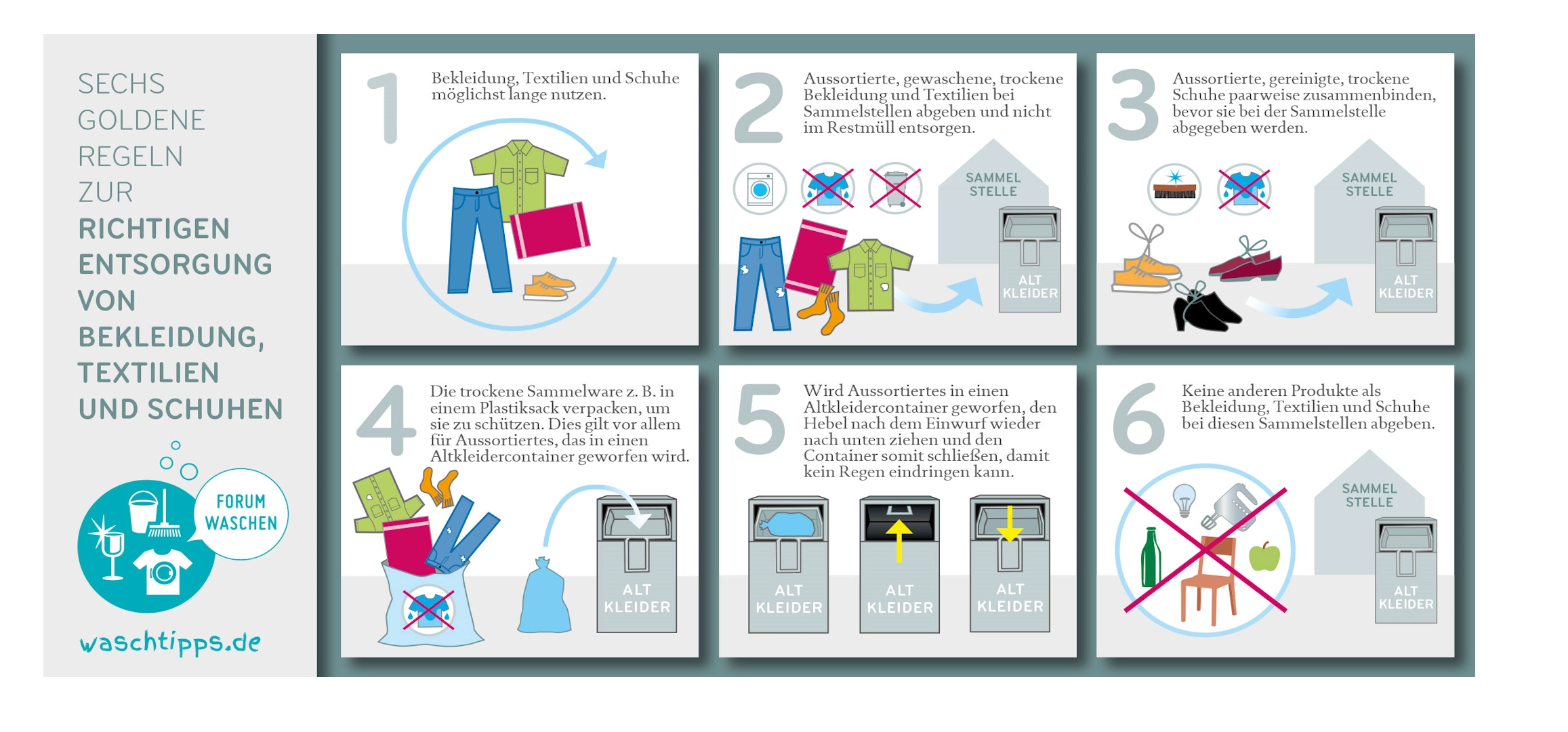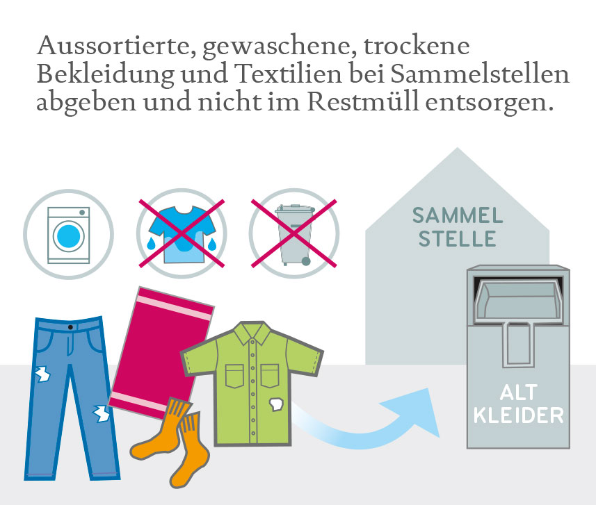 Aussortierte, gewaschene, trockene Bekleidung und Textilien sollten bei Sammelstellen abgegeben und nicht im Restmüll entsorgt werden. Die Weitergabe und das Recycling von Bekleidung, Textilien und auch von Schuhen können einen wertvollen Beitrag für die Umwelt leisten. Sorgfältig sortiert und aufbereitet können diese Produkte im Kreislauf gehalten und letztlich noch als Sekundärrohstoff künftig weiterverwendet werden. Mehr Informationen finden sich in den Sechs Goldenen Regeln.