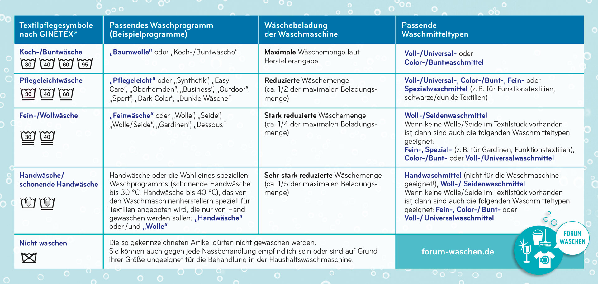 Wasch-Hinweise zu Waschtemperaturen, Waschprogrammen, Wäschebeladung und WaschmitteltypenAlle Pflegesymbole für richtiges Wäschewaschen